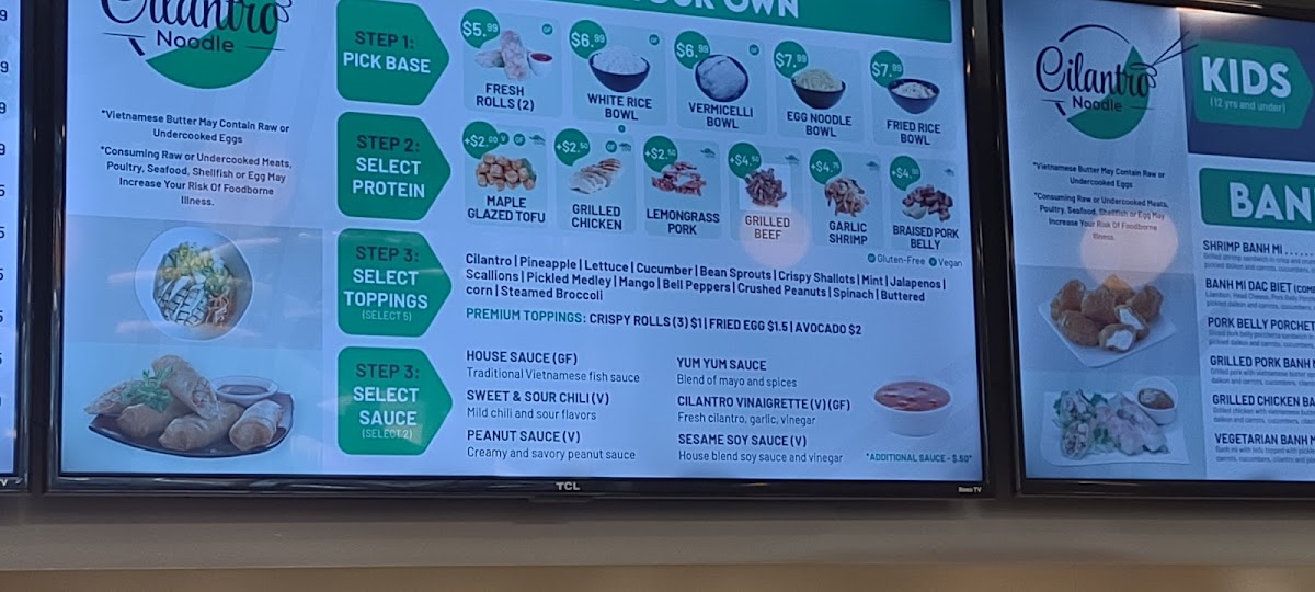 Cilantro | Pineapple | Lettuce | Cucumber | Bean Sprouts | Crispy Shallots | Mint | Jalapenos | Scallions | Pickled Medley | Mango | Bell Peppers | Crushed Peanuts | Buttered corn | Steamed Broccoli PREMIUM TOPPINGS: Crispy Rolls (3) $1 | Fried Egg $2 | Avocado $2 | Stir-Fry Mixed Veggies $1
